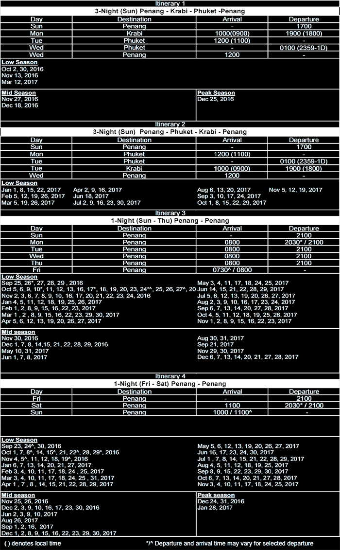 Currency used onboard is Malaysian Ringgit. Prior to disembarkation, please ensure that all outstanding bills are cleared before retrieving your passport. Cruise fare includes meals and selected beverages at inclusive restaurants. Please note all heating devices such as iron, cooking plate, water heater, etc. are prohibited onboard the cruise. All Guest are strictly prohibited from bringing any alcohol, alcoholic drink, intoxicating liquor or beverage onboard the ship. Star Cruises reserves the right to refuse any passengers whose condition is not made known to the cruise line prior to sailing, and shall not be required to refund any portion of the cruise fare paid by these passengers. Subject to Star Cruises’ Terms and Conditions.